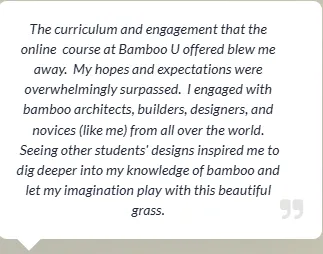 Once the course begins, you get instant access to the Online Platform. Over 600 people have taken this course and the Bamboo U Online Platform is your portal to bamboo knowledge from around the world. Giving you access to bamboo experts, enthusiasts and a wealth of knowledge all in one place!